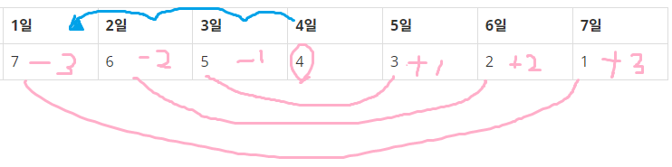 1일엔 7개를 보았고, 7일엔 1개를 보았다. 이 둘을 더해 둘로 나누면, 즉, 서로 양을 나눠가지면 각각 4가 된다. 둘째 날엔 6개를 보았고, 엿새엔 2개를 보았다. 이 역시 마찬가지로 둘을 더해 동일하게 나누면, 각각 4가 된다. 이 방법을 계속하면, 모든 날짜가 동일하게 4를 가질 수 있다. 쉽게 말해, N이 7의 배수라면 N을 7로 나눈 값(평균)이 4일에 해당하는 셈이고, 여기에 3을 더하면 첫째 날에 봐야 할 영상 개수를 알 수 있는 것이다.